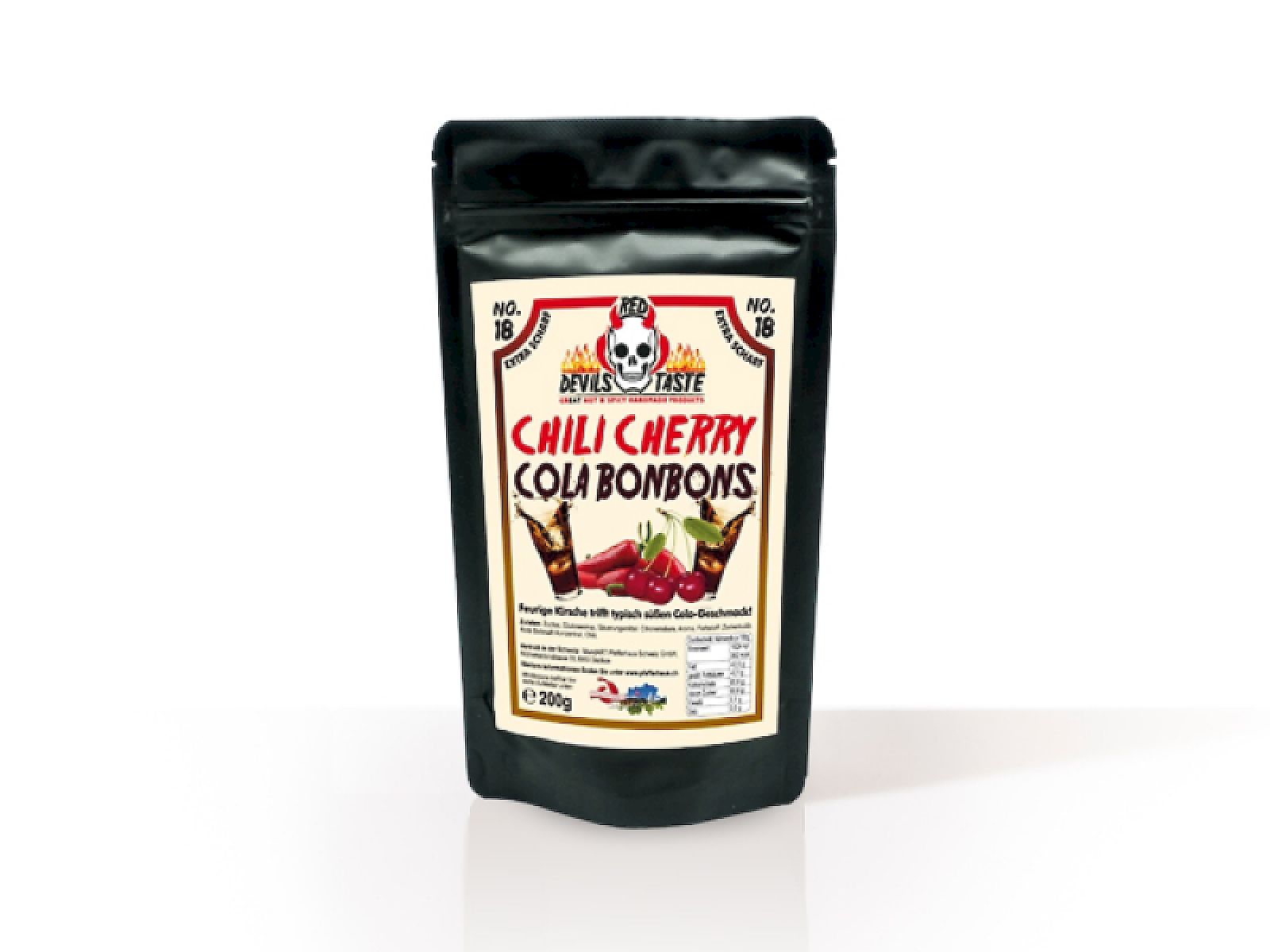 Diese extra scharfen Chili-Kirsch- und Cola-Bonbons muss der Teufel leibhaftig kreiert haben - denn wie sonst können Bonbons gleichzeitig so süß, so schmelzend fein und gleichzeitig so feurig scharf sein? Feurige Kirsche trifft typisch süßen Cola-Geschmack, wenn der Teufel den Schmelztiegel glühen lässt: So mancher, der es gerne extra scharf mag, würde für unser Kirsch- und Cola-Bonbon aus eigener Kreation seine Seele verkaufen.
