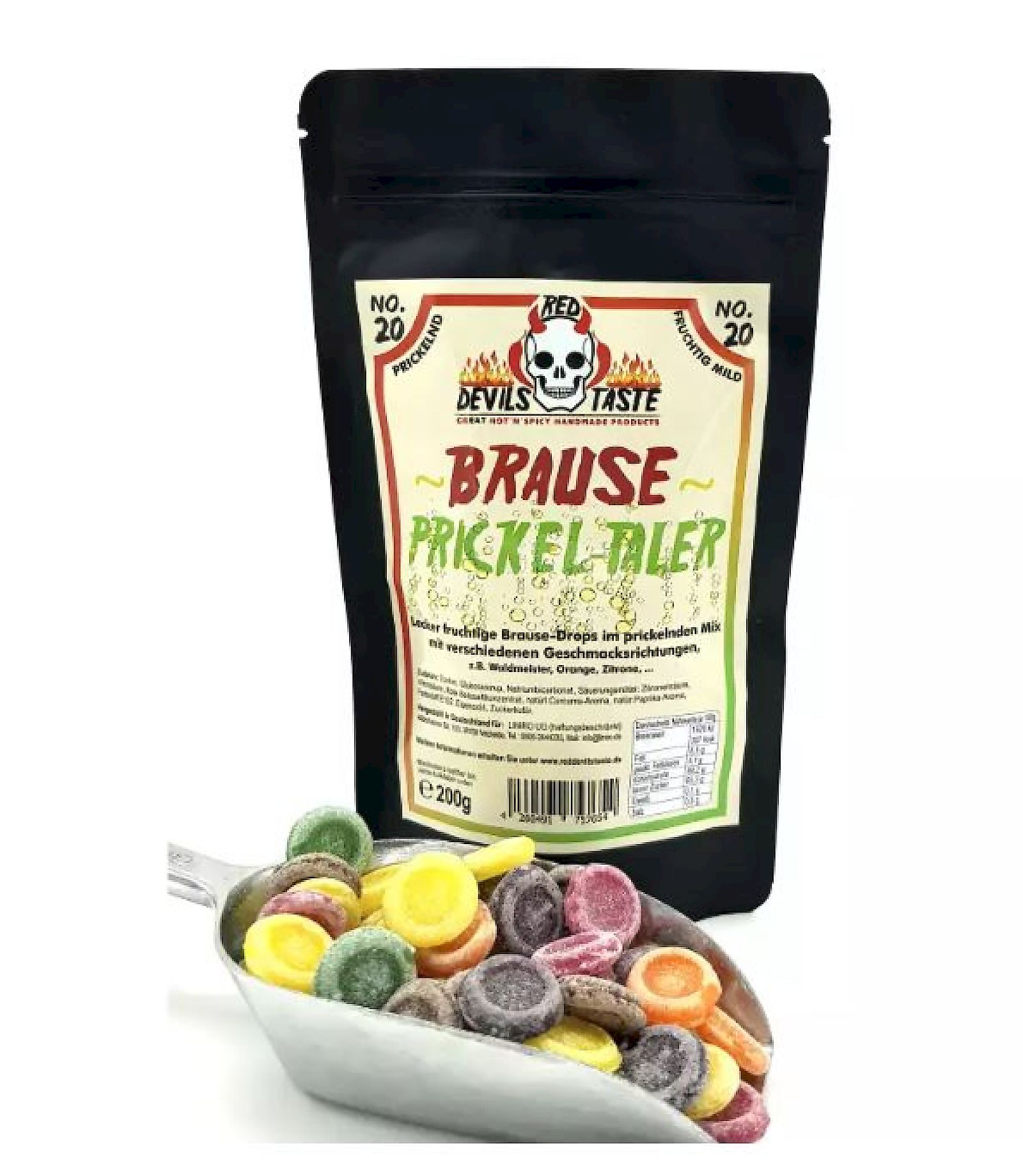 Die Red Devils Taste Brause Drops sind mild und wohltuhend! Als Brause Bonbons mit Brausepulver prickeln sie auf der Zunge und bringen Erfrischung! Das gefällt nicht nur Erwachsenen, auch für Kinder sind die Red Devils Taste Bonbons geeignet. Die deutsche Bonbon Manufaktur arbeitet handwerklich und achtet auf hochwertige Zutaten. Die Bonbons werden überwiegend mit ätherischen Ölen und natürlichen Aromen hergestellt. In der Tüte finden Sie Brause Drops in Taler Form unterschiedlicher Geschmacksrichtungen, darunter Waldmeister, Orange und Zitrone. Die deutsche Bonbon Manufaktur hat eine bunte Mischung mit unterschiedlichen Farben für Sie zusammengestellt. Mit einem Prickeln zergehen die mild und wohluend wirkenden Brause Bonbons mit Bruasepulver im Mund und die Aromen werden frei. Die brausig frischen Red Devil Taste Brause Bonbons in Taler Form sind ein echter Genuss!