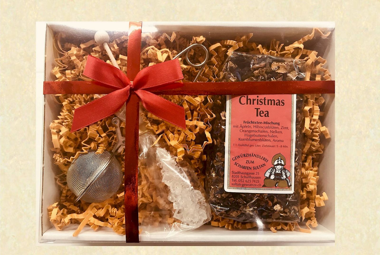 Dieses Geschenkset beinhaltet einen Christmastea (140g), einen Kandisstick und eine Teezange (5cm Ø)