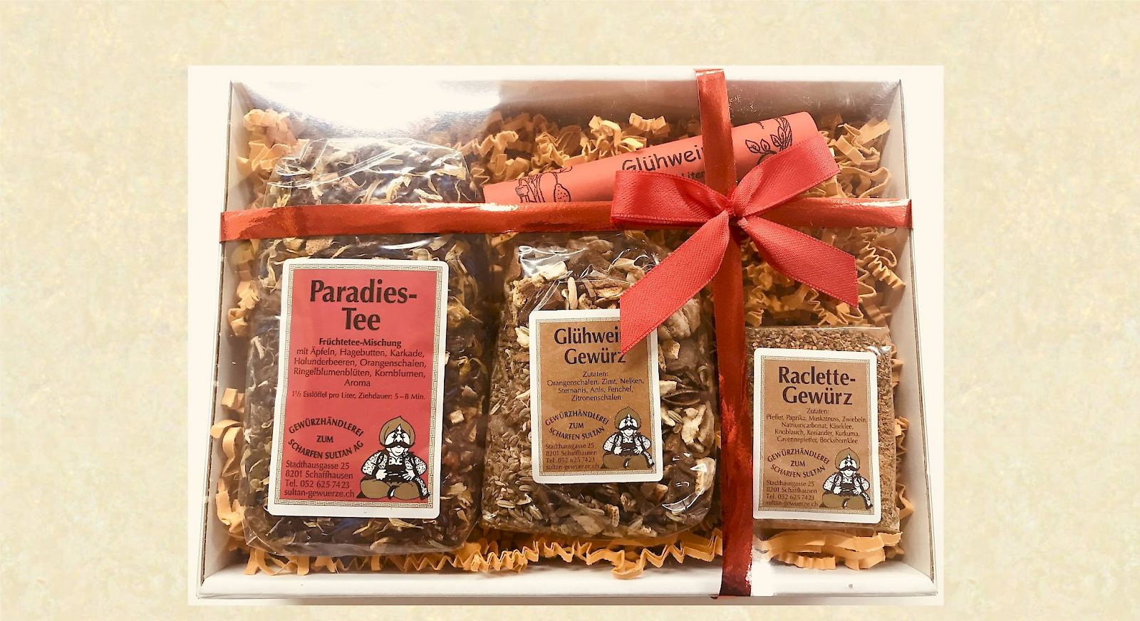 Dieses Geschenkset beinhaltet einen Paradiestee (140g), Glühweingewürz (120g) mit Rezept und ein Raclette Gewürz (70g)