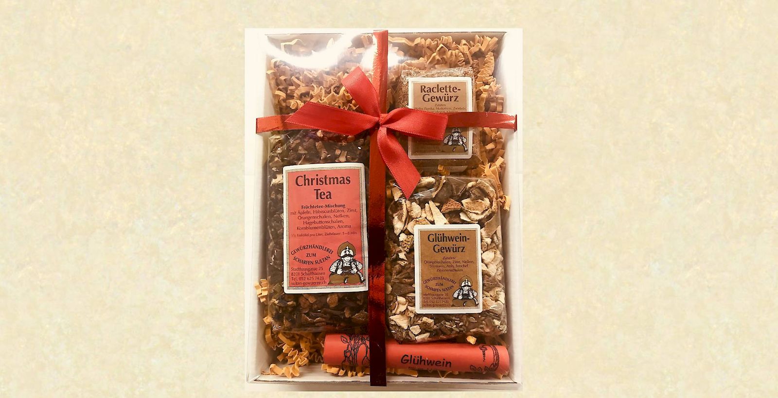 Dieses Geschenkset beinhaltet einen Christmastea (140g), Glühweingewürz (120g) mit Rezept und ein Raclette Gewürz (70g)