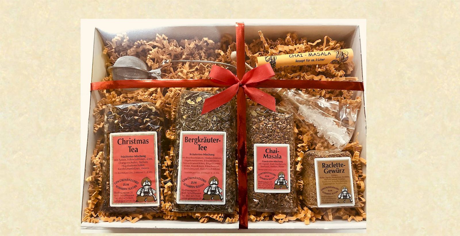Bei grösseren Bestellungen sind die Tee oder Gewürzsorten variabel.