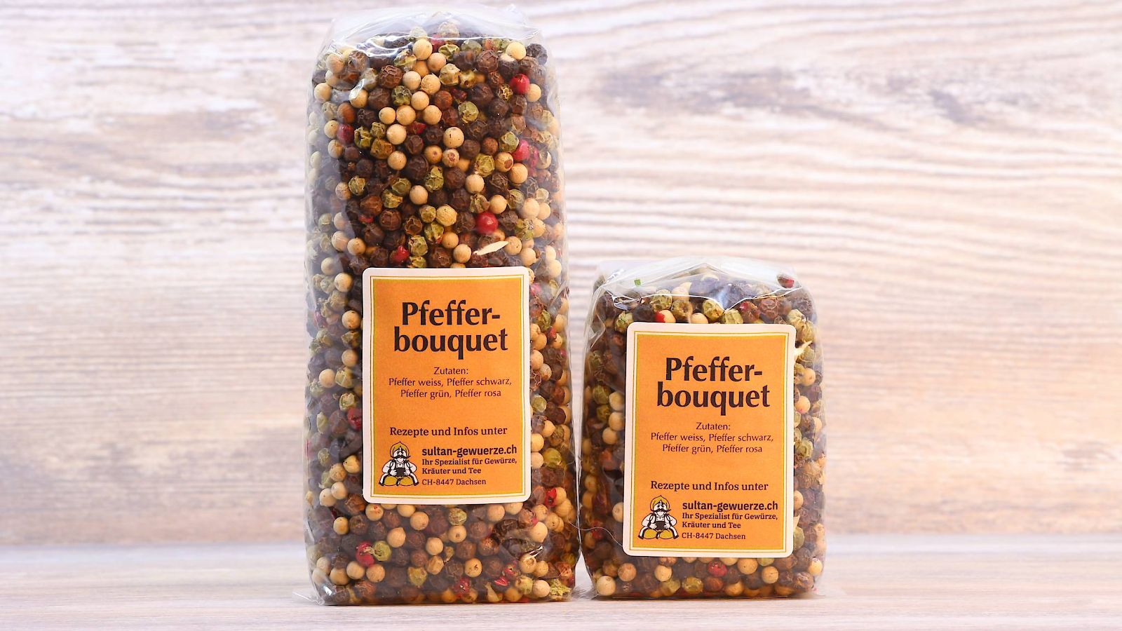 Unser Pfefferbouquet ist eine reine Pfeffermischung, bestehend aus weissem, schwarzem, grünem und rosa Pfeffer.