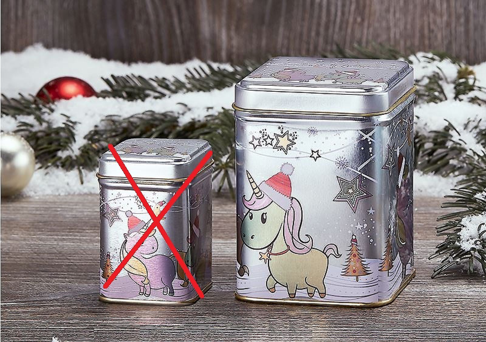 Dose "Merry Wishes", 100 g Weißblech, eckig, Stülpdeckel 2-fach sortiert 7 x 7 x 10,9 cm Dose Typ 1 (links) Dose… mehr