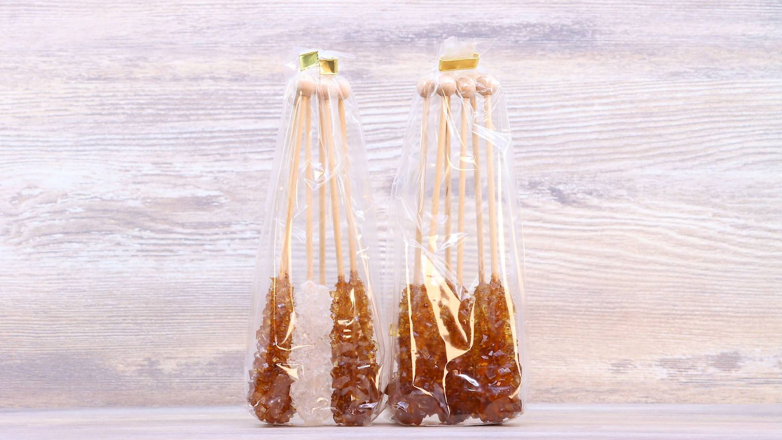 Zur Herstellung der Candy Sticks werden Holzstäbchen in eine hochkonzentrierte Lösung braunen Zuckers gehängt. Beim langsamen Abkühlen der Lösung kristallisiert der Zucker an der Holzoberfläche.